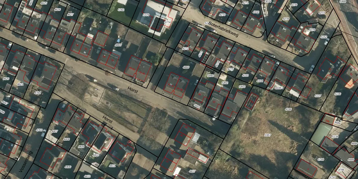 Het perceel waarop Horst 36 staat heeft een oppervlakte van 513 m². Dit is een groot perceel. De perceeloppervlakte wordt geregistreerd door het Kadaster. Gedetailleerde informatie over de maten van dit perceel kunt u vinden in het rapport Kadastrale kaart met maatvoering van Horst 36.