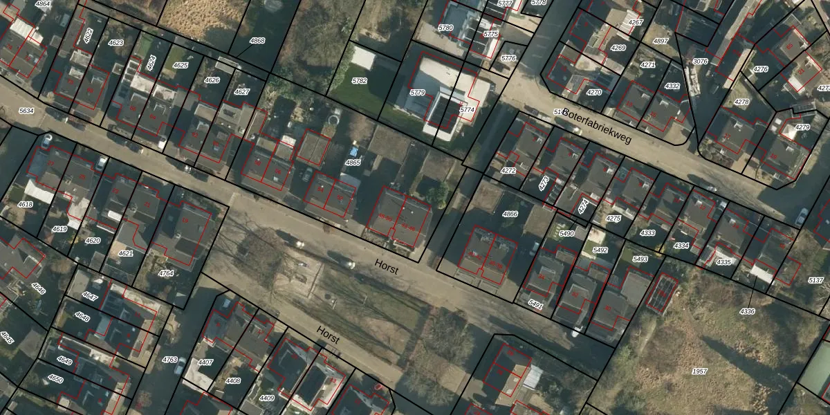 Het perceel waarop Horst 46 staat heeft een oppervlakte van 1413 m². Dit is een zeer groot perceel. De perceeloppervlakte wordt geregistreerd door het Kadaster. Gedetailleerde informatie over de maten van dit perceel kunt u vinden in het rapport Kadastrale kaart met maatvoering van Horst 46.