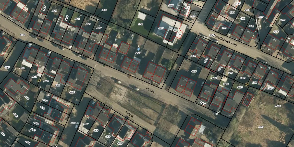 Het perceel waarop Horst 50 staat heeft een oppervlakte van 1413 m². Dit is een zeer groot perceel. De perceeloppervlakte wordt geregistreerd door het Kadaster. Gedetailleerde informatie over de maten van dit perceel kunt u vinden in het rapport Kadastrale kaart met maatvoering van Horst 50.