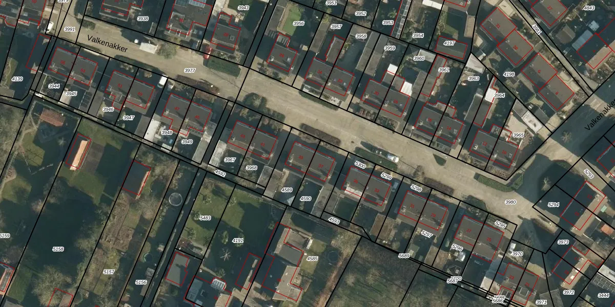 Het perceel waarop Valkenakker 39 staat heeft een oppervlakte van 238 m². Dit is een middelgroot perceel. De perceeloppervlakte wordt geregistreerd door het Kadaster. Gedetailleerde informatie over de maten van dit perceel kunt u vinden in het rapport Kadastrale kaart met maatvoering van Valkenakker 39.