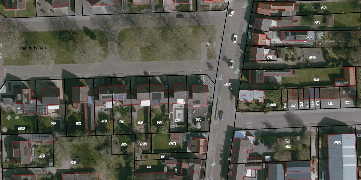 Het perceel waarop Kennedylaan 3 staat heeft een oppervlakte van 323 m². Dit is een groot perceel. De perceeloppervlakte wordt geregistreerd door het Kadaster. Gedetailleerde informatie over de maten van dit perceel kunt u vinden in het rapport Kadastrale kaart met maatvoering van Kennedylaan 3.