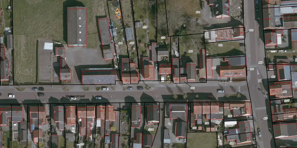 Het perceel waarop Molenstraat 14 staat heeft een oppervlakte van 805 m². Dit is een groot perceel. De perceeloppervlakte wordt geregistreerd door het Kadaster. Gedetailleerde informatie over de maten van dit perceel kunt u vinden in het rapport Kadastrale kaart met maatvoering van Molenstraat 14.