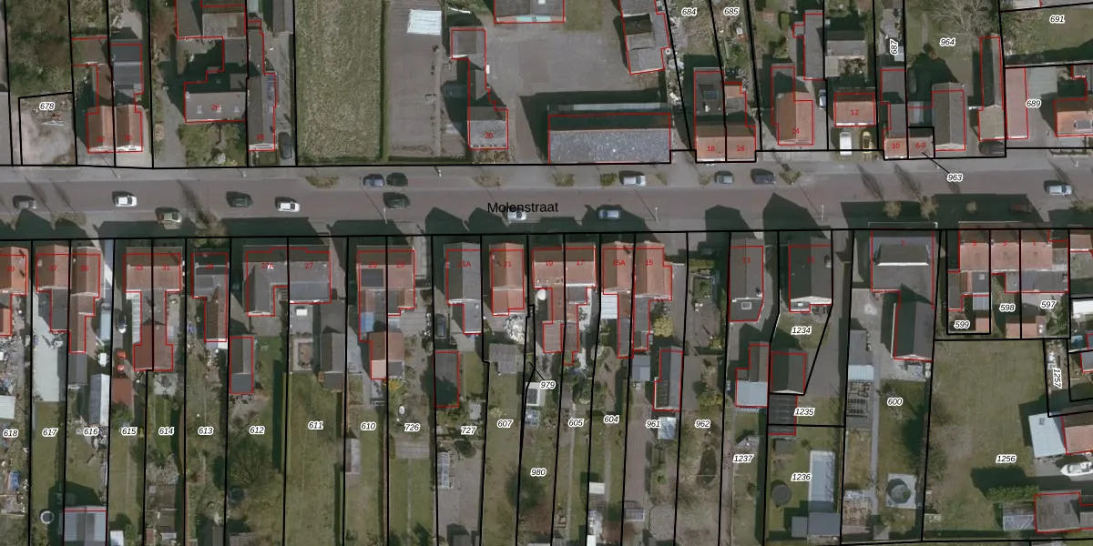 Het perceel waarop Molenstraat 19 staat heeft een oppervlakte van 375 m². Dit is een groot perceel. De perceeloppervlakte wordt geregistreerd door het Kadaster. Gedetailleerde informatie over de maten van dit perceel kunt u vinden in het rapport Kadastrale kaart met maatvoering van Molenstraat 19.