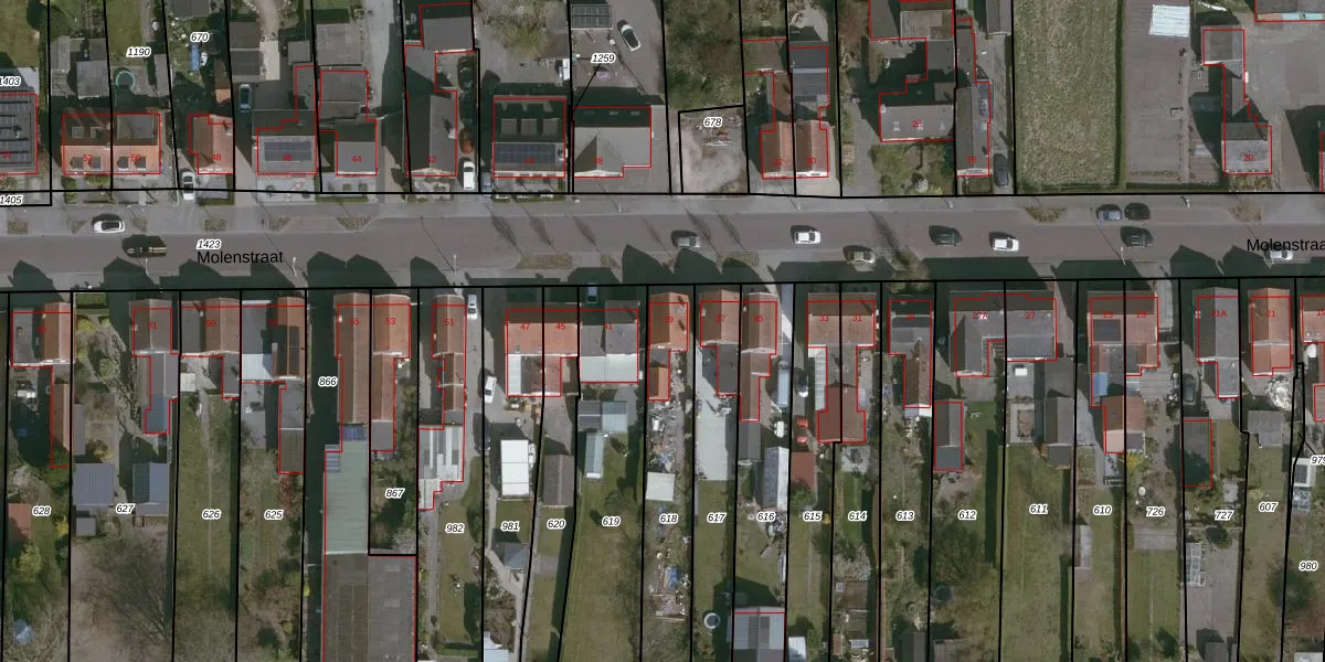 Het perceel waarop Molenstraat 39 staat heeft een oppervlakte van 455 m². Dit is een groot perceel. De perceeloppervlakte wordt geregistreerd door het Kadaster. Gedetailleerde informatie over de maten van dit perceel kunt u vinden in het rapport Kadastrale kaart met maatvoering van Molenstraat 39.
