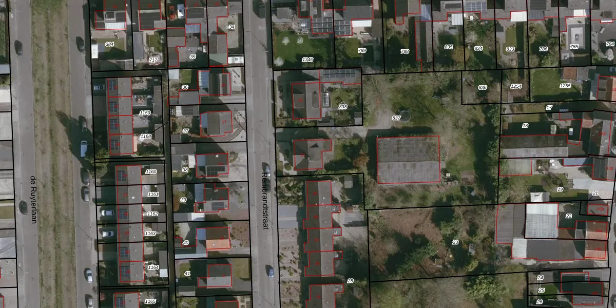 Het perceel waarop Rembrandtstraat 34 staat heeft een oppervlakte van 2235 m². Dit is een zeer groot perceel. De perceeloppervlakte wordt geregistreerd door het Kadaster. Gedetailleerde informatie over de maten van dit perceel kunt u vinden in het rapport Kadastrale kaart met maatvoering van Rembrandtstraat 34.