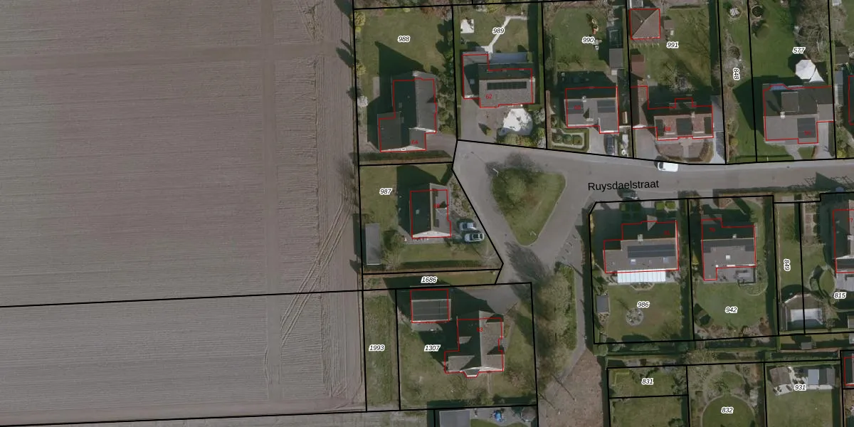 Het perceel waarop Ruysdaelstraat 66 staat heeft een oppervlakte van 696 m². Dit is een groot perceel. De perceeloppervlakte wordt geregistreerd door het Kadaster. Gedetailleerde informatie over de maten van dit perceel kunt u vinden in het rapport Kadastrale kaart met maatvoering van Ruysdaelstraat 66.
