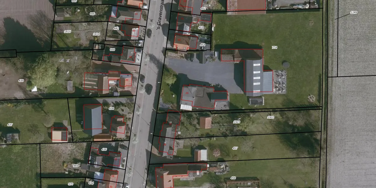 Het perceel waarop 's-Gravenstraat 25 staat heeft een oppervlakte van 3855 m². Dit is een zeer groot perceel. De perceeloppervlakte wordt geregistreerd door het Kadaster. Gedetailleerde informatie over de maten van dit perceel kunt u vinden in het rapport Kadastrale kaart met maatvoering van 's-Gravenstraat 25.