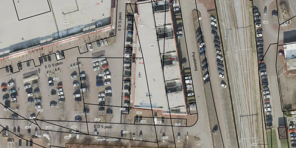 Het perceel waarop E D S plein 31 staat heeft een oppervlakte van 970 m². Dit is een groot perceel. De perceeloppervlakte wordt geregistreerd door het Kadaster. Gedetailleerde informatie over de maten van dit perceel kunt u vinden in het rapport Kadastrale kaart met maatvoering van E D S plein 31.