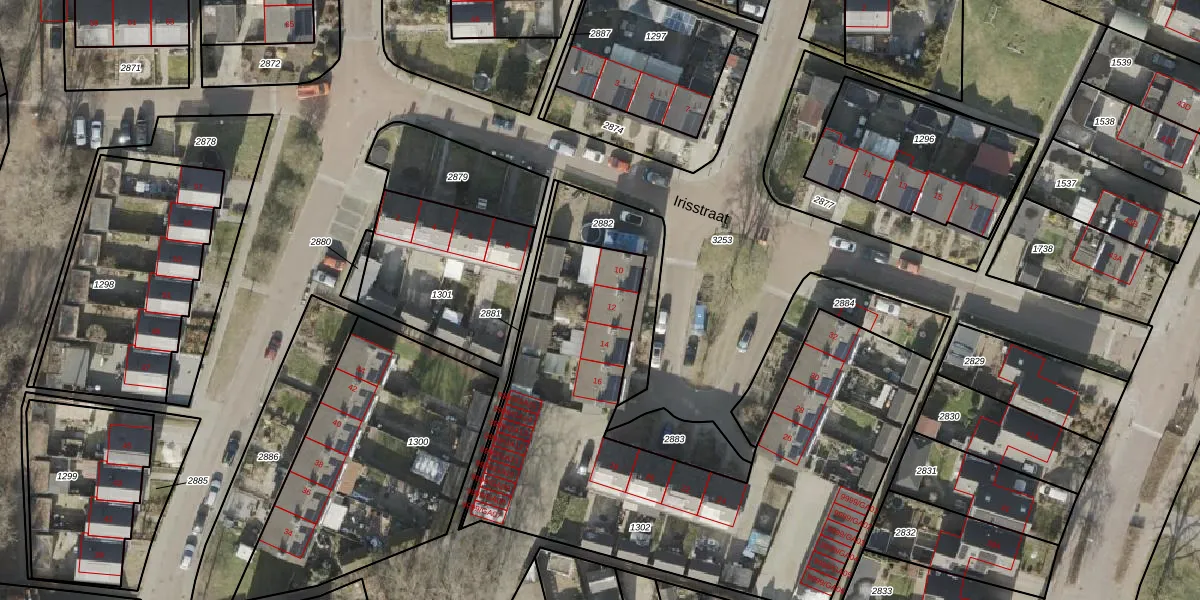 Het perceel waarop Irisstraat 12 staat heeft een oppervlakte van 2305 m². Dit is een zeer groot perceel. De perceeloppervlakte wordt geregistreerd door het Kadaster. Gedetailleerde informatie over de maten van dit perceel kunt u vinden in het rapport Kadastrale kaart met maatvoering van Irisstraat 12.