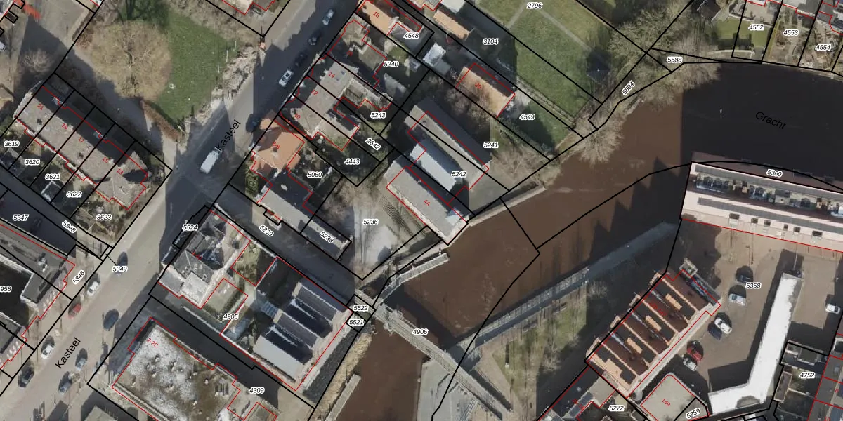Het perceel waarop Kasteel 4-A staat heeft een oppervlakte van 585 m². Dit is een groot perceel. De perceeloppervlakte wordt geregistreerd door het Kadaster. Gedetailleerde informatie over de maten van dit perceel kunt u vinden in het rapport Kadastrale kaart met maatvoering van Kasteel 4-A.