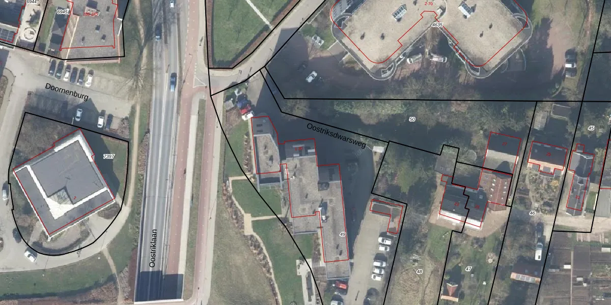 Oostriksdwarsweg 12 is gelegen op kadastraal perceel DVT00L49. Deze kadastrale aanduiding is uniek en wordt gebruikt door het Kadaster om eigendomsrechten en andere zakelijke rechten vast te leggen. Het perceel maakt onderdeel uit van de kadastrale gemeente Deventer.