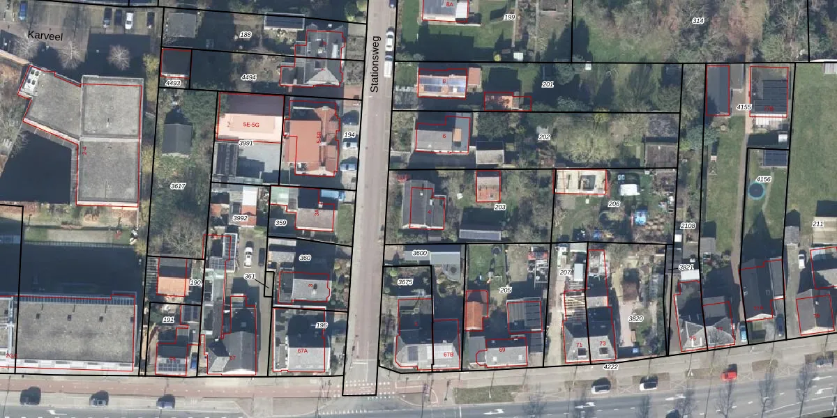 Gebruik de zoekbalk of klik op een perceel voor informatie over de adressen binnen dit perceel.