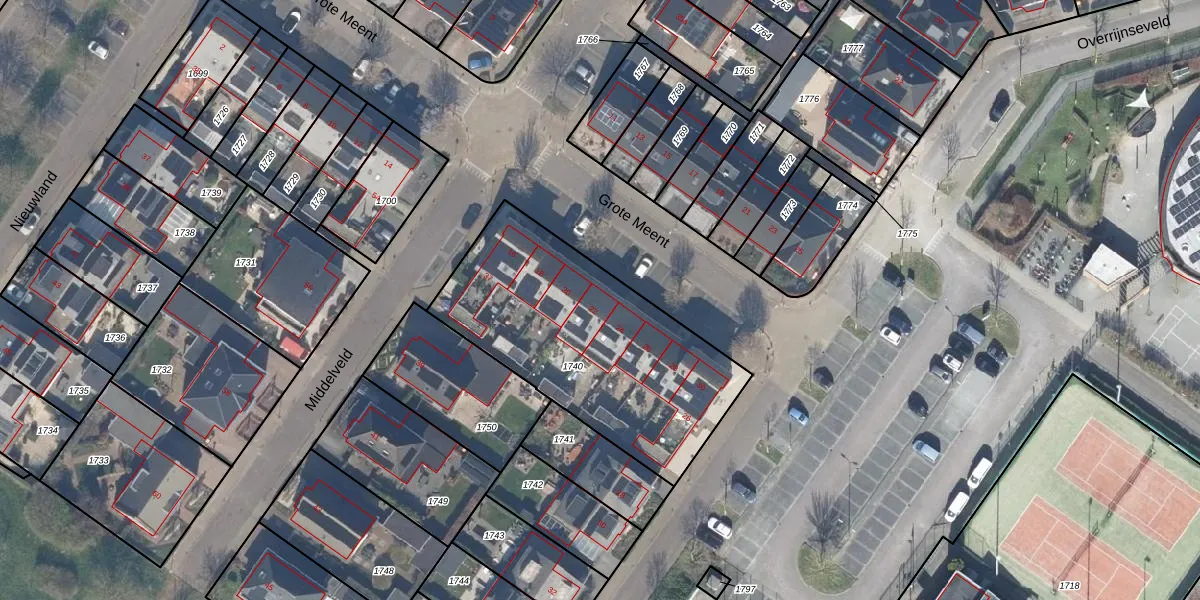 Het perceel waarop Grote Meent 22 staat heeft een oppervlakte van 1148 m². Dit is een zeer groot perceel. De perceeloppervlakte wordt geregistreerd door het Kadaster. Gedetailleerde informatie over de maten van dit perceel kunt u vinden in het rapport Kadastrale kaart met maatvoering van Grote Meent 22.