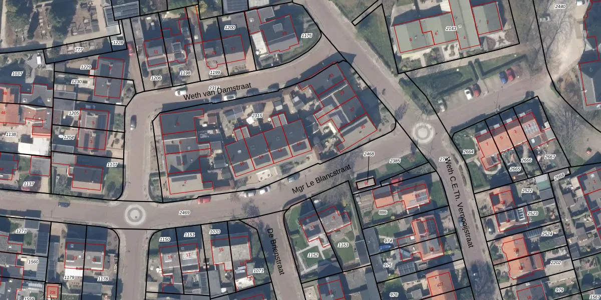 Het perceel waarop Mgr Le Blancstraat 10 staat heeft een oppervlakte van 2145 m². Dit is een zeer groot perceel. De perceeloppervlakte wordt geregistreerd door het Kadaster. Gedetailleerde informatie over de maten van dit perceel kunt u vinden in het rapport Kadastrale kaart met maatvoering van Mgr Le Blancstraat 10.
