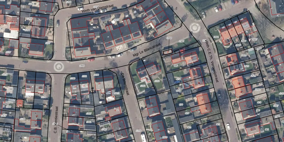 Het perceel waarop Mgr Le Blancstraat 11 staat heeft een oppervlakte van 307 m². Dit is een groot perceel. De perceeloppervlakte wordt geregistreerd door het Kadaster. Gedetailleerde informatie over de maten van dit perceel kunt u vinden in het rapport Kadastrale kaart met maatvoering van Mgr Le Blancstraat 11.