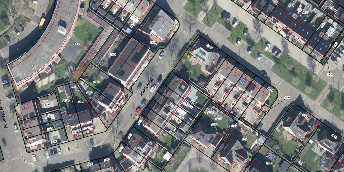 Het perceel waarop Middelveld 1 staat heeft een oppervlakte van 255 m². Dit is een middelgroot perceel. De perceeloppervlakte wordt geregistreerd door het Kadaster. Gedetailleerde informatie over de maten van dit perceel kunt u vinden in het rapport Kadastrale kaart met maatvoering van Middelveld 1.