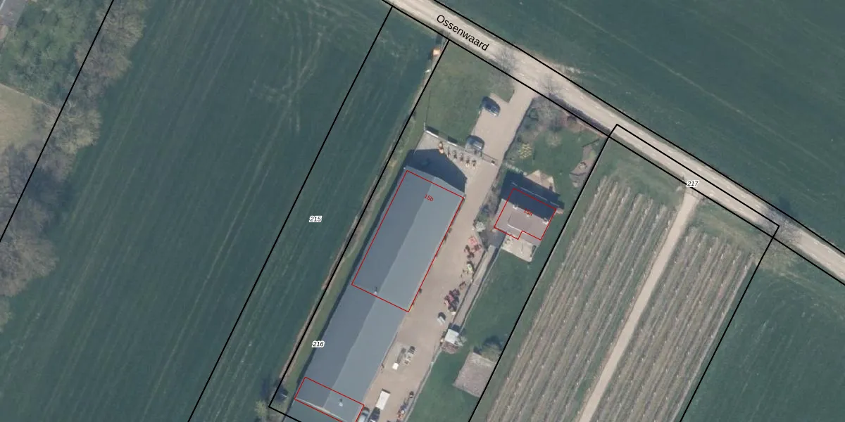 Ossenwaard 15-b is gelegen op kadastraal perceel CTN00D216. Deze kadastrale aanduiding is uniek en wordt gebruikt door het Kadaster om eigendomsrechten en andere zakelijke rechten vast te leggen. Het perceel maakt onderdeel uit van de kadastrale gemeente Cothen.