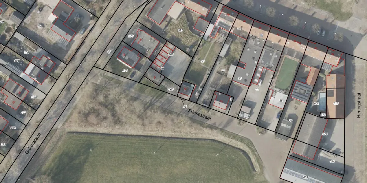 Het perceel waarop Friesestraat 21 staat heeft een oppervlakte van 64 m². Dit is een klein perceel. De perceeloppervlakte wordt geregistreerd door het Kadaster. Gedetailleerde informatie over de maten van dit perceel kunt u vinden in het rapport Kadastrale kaart met maatvoering van Friesestraat 21.