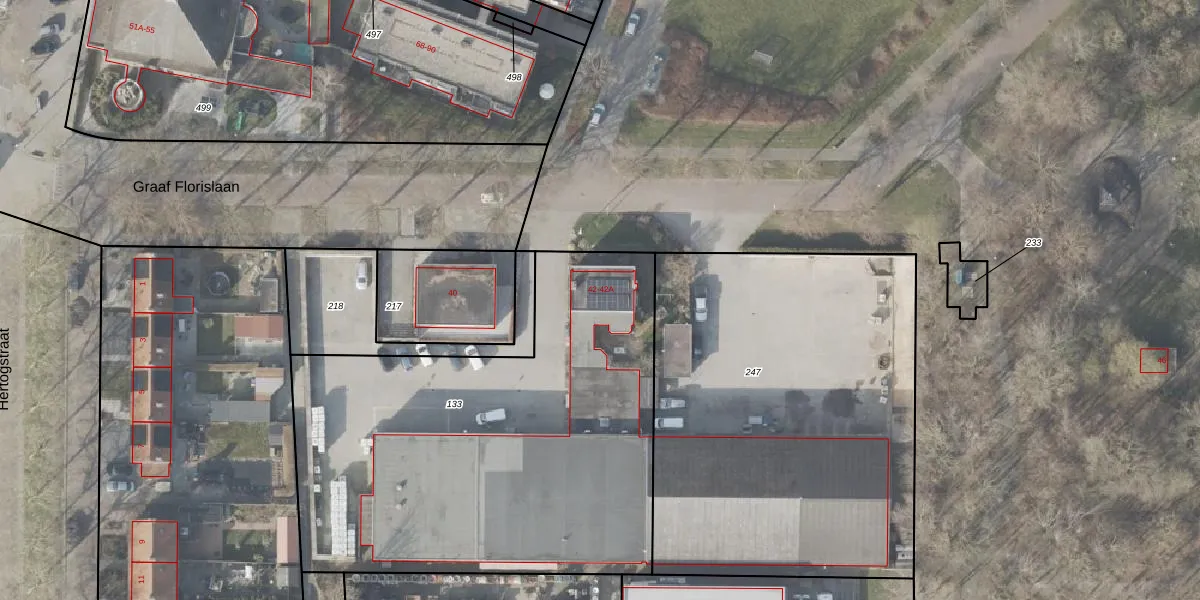 Het perceel waarop Graaf Florislaan 42 staat heeft een oppervlakte van 2519 m². Dit is een zeer groot perceel. De perceeloppervlakte wordt geregistreerd door het Kadaster. Gedetailleerde informatie over de maten van dit perceel kunt u vinden in het rapport Kadastrale kaart met maatvoering van Graaf Florislaan 42.