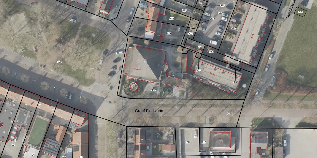 Het perceel waarop Graaf Florislaan 51-B staat heeft een oppervlakte van 2442 m². Dit is een zeer groot perceel. De perceeloppervlakte wordt geregistreerd door het Kadaster. Gedetailleerde informatie over de maten van dit perceel kunt u vinden in het rapport Kadastrale kaart met maatvoering van Graaf Florislaan 51-B.