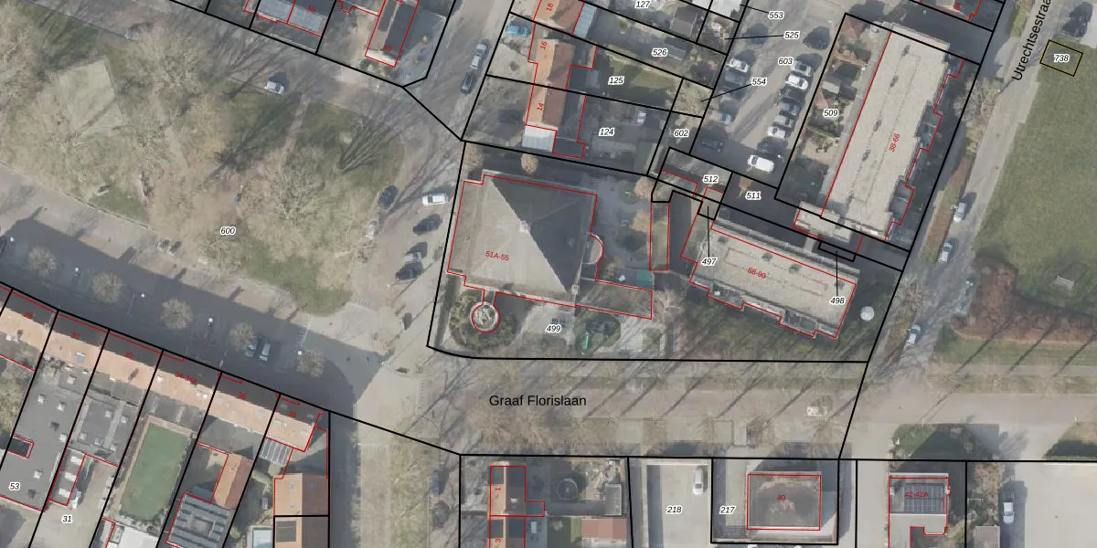 Het perceel waarop Graaf Florislaan 51-E staat heeft een oppervlakte van 2442 m². Dit is een zeer groot perceel. De perceeloppervlakte wordt geregistreerd door het Kadaster. Gedetailleerde informatie over de maten van dit perceel kunt u vinden in het rapport Kadastrale kaart met maatvoering van Graaf Florislaan 51-E.