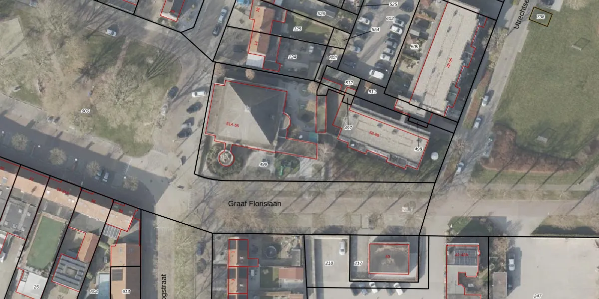 Het perceel waarop Graaf Florislaan 55 staat heeft een oppervlakte van 2442 m². Dit is een zeer groot perceel. De perceeloppervlakte wordt geregistreerd door het Kadaster. Gedetailleerde informatie over de maten van dit perceel kunt u vinden in het rapport Kadastrale kaart met maatvoering van Graaf Florislaan 55.
