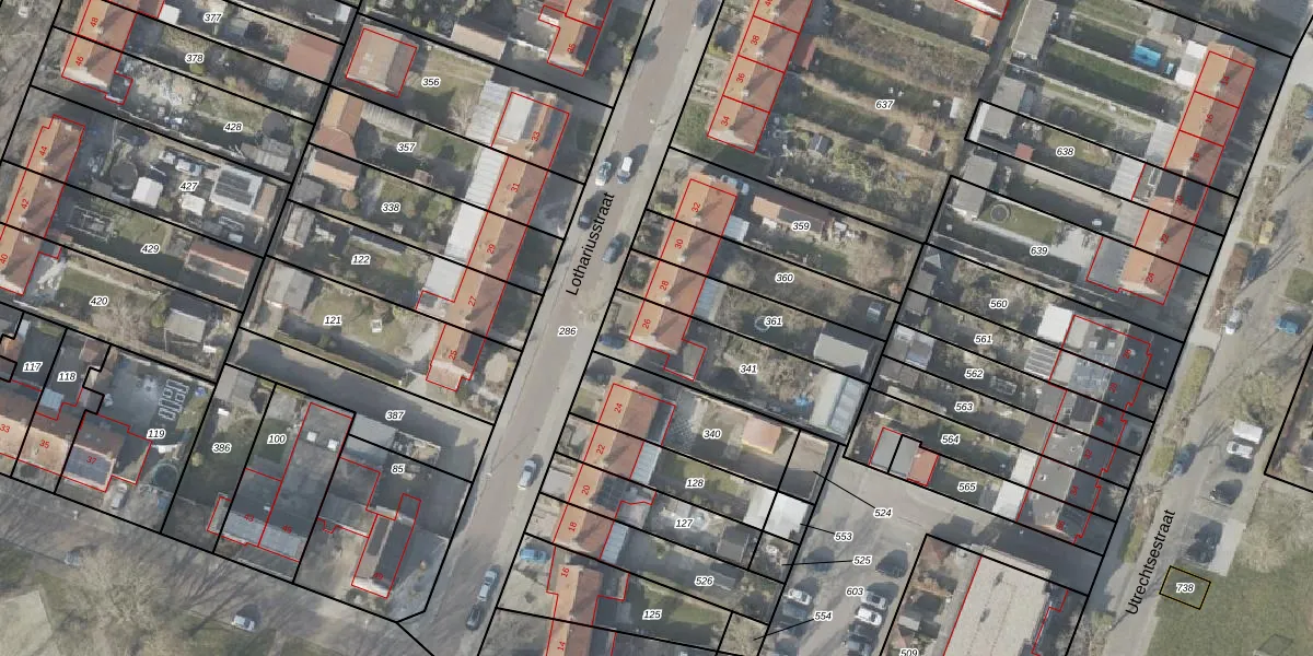 Het perceel waarop Lothariusstraat 26 staat heeft een oppervlakte van 422 m². Dit is een groot perceel. De perceeloppervlakte wordt geregistreerd door het Kadaster. Gedetailleerde informatie over de maten van dit perceel kunt u vinden in het rapport Kadastrale kaart met maatvoering van Lothariusstraat 26.