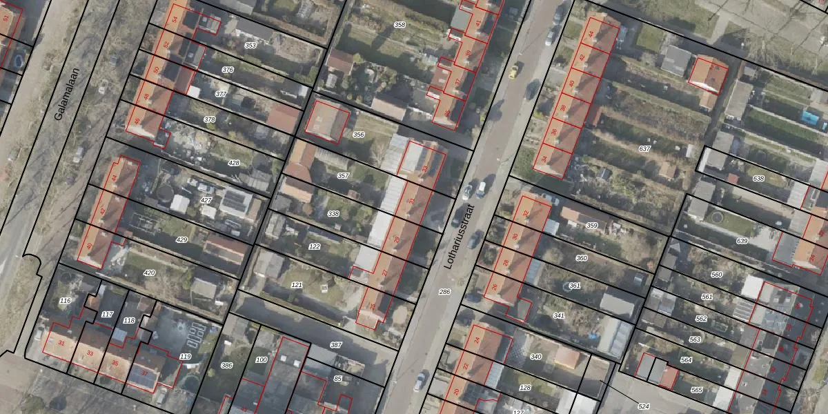 Het perceel waarop Lothariusstraat 31 staat heeft een oppervlakte van 379 m². Dit is een groot perceel. De perceeloppervlakte wordt geregistreerd door het Kadaster. Gedetailleerde informatie over de maten van dit perceel kunt u vinden in het rapport Kadastrale kaart met maatvoering van Lothariusstraat 31.
