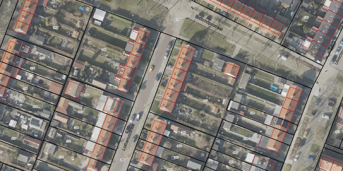 Het perceel waarop Lothariusstraat 38 staat heeft een oppervlakte van 3155 m². Dit is een zeer groot perceel. De perceeloppervlakte wordt geregistreerd door het Kadaster. Gedetailleerde informatie over de maten van dit perceel kunt u vinden in het rapport Kadastrale kaart met maatvoering van Lothariusstraat 38.
