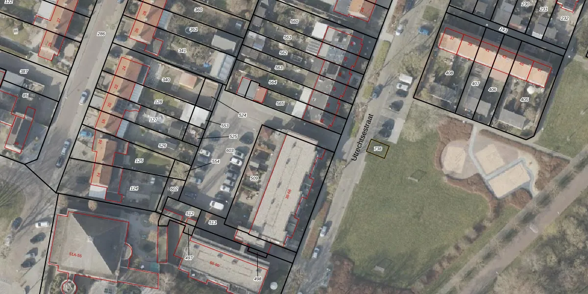 Het perceel waarop Utrechtsestraat 50 staat heeft een oppervlakte van 956 m². Dit is een groot perceel. De perceeloppervlakte wordt geregistreerd door het Kadaster. Gedetailleerde informatie over de maten van dit perceel kunt u vinden in het rapport Kadastrale kaart met maatvoering van Utrechtsestraat 50.