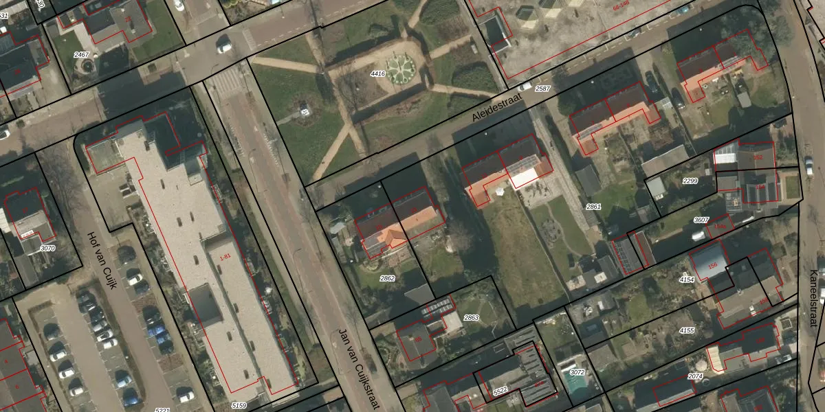 Aleidestraat 13 is gelegen op kadastraal perceel CUI00C2861. Deze kadastrale aanduiding is uniek en wordt gebruikt door het Kadaster om eigendomsrechten en andere zakelijke rechten vast te leggen. Het perceel maakt onderdeel uit van de kadastrale gemeente Cuijk.