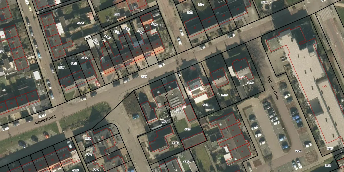 Het perceel waarop Aleidestraat 19 staat heeft een oppervlakte van 557 m². Dit is een groot perceel. De perceeloppervlakte wordt geregistreerd door het Kadaster. Gedetailleerde informatie over de maten van dit perceel kunt u vinden in het rapport Kadastrale kaart met maatvoering van Aleidestraat 19.
