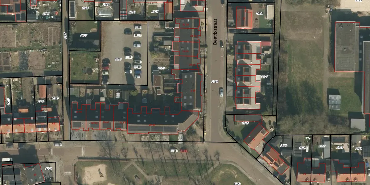 Het perceel waarop Beatrixstraat 12 staat heeft een oppervlakte van 3746 m². Dit is een zeer groot perceel. De perceeloppervlakte wordt geregistreerd door het Kadaster. Gedetailleerde informatie over de maten van dit perceel kunt u vinden in het rapport Kadastrale kaart met maatvoering van Beatrixstraat 12.