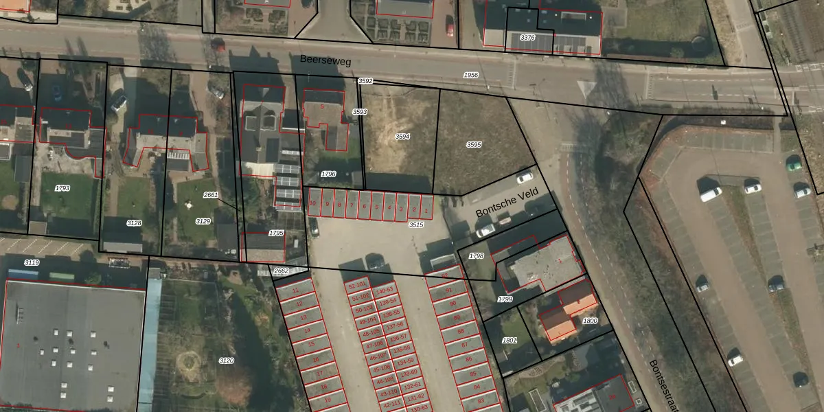 Het perceel waarop Bontsche Veld 2 staat heeft een oppervlakte van 1030 m². Dit is een zeer groot perceel. De perceeloppervlakte wordt geregistreerd door het Kadaster. Gedetailleerde informatie over de maten van dit perceel kunt u vinden in het rapport Kadastrale kaart met maatvoering van Bontsche Veld 2.