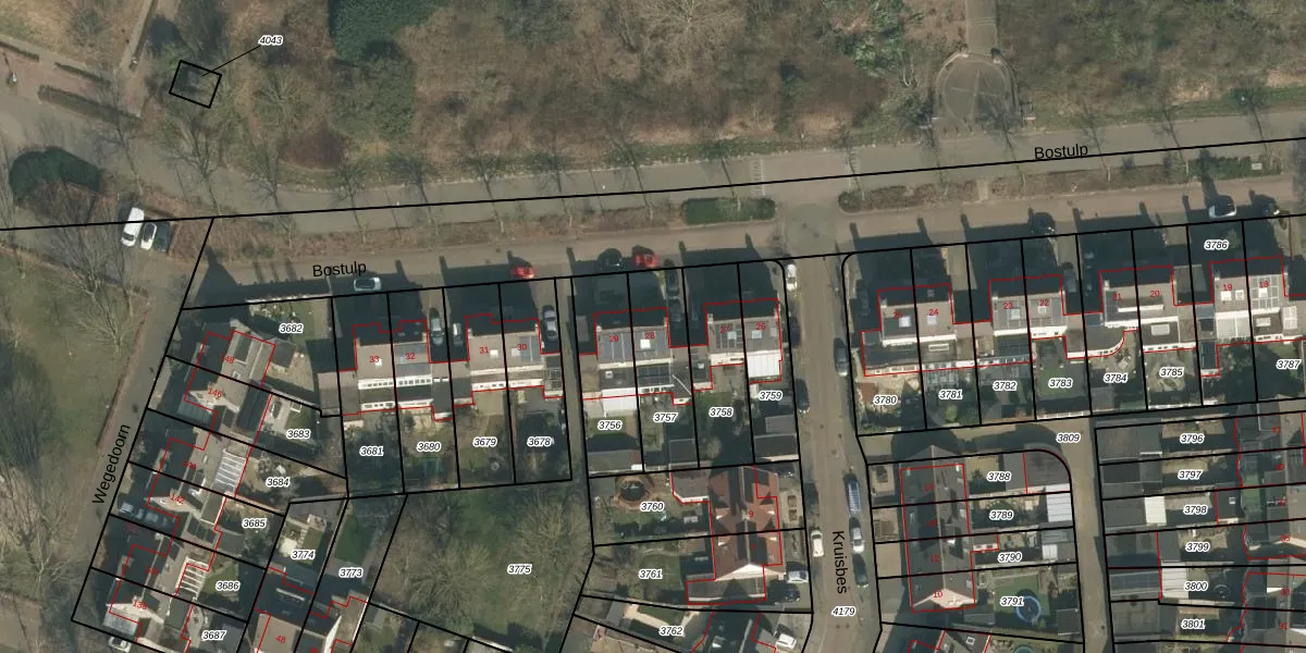 Het perceel waarop Bostulp 28 staat heeft een oppervlakte van 262 m². Dit is een middelgroot perceel. De perceeloppervlakte wordt geregistreerd door het Kadaster. Gedetailleerde informatie over de maten van dit perceel kunt u vinden in het rapport Kadastrale kaart met maatvoering van Bostulp 28.