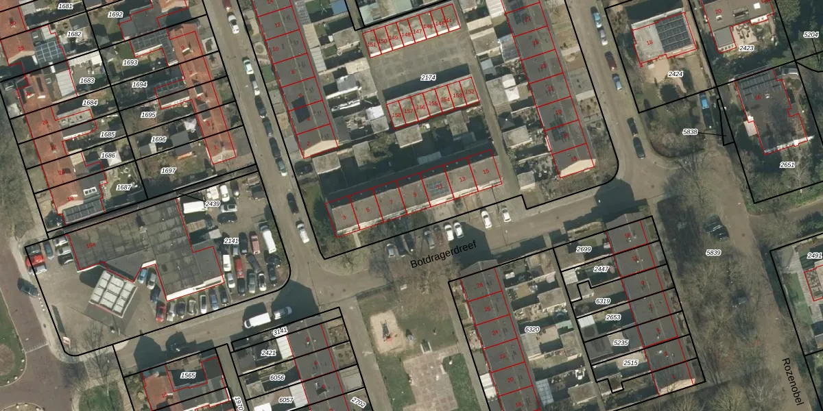 Botdragerdreef 9 is gelegen op kadastraal perceel CUI00A2174. Deze kadastrale aanduiding is uniek en wordt gebruikt door het Kadaster om eigendomsrechten en andere zakelijke rechten vast te leggen. Het perceel maakt onderdeel uit van de kadastrale gemeente Cuijk.