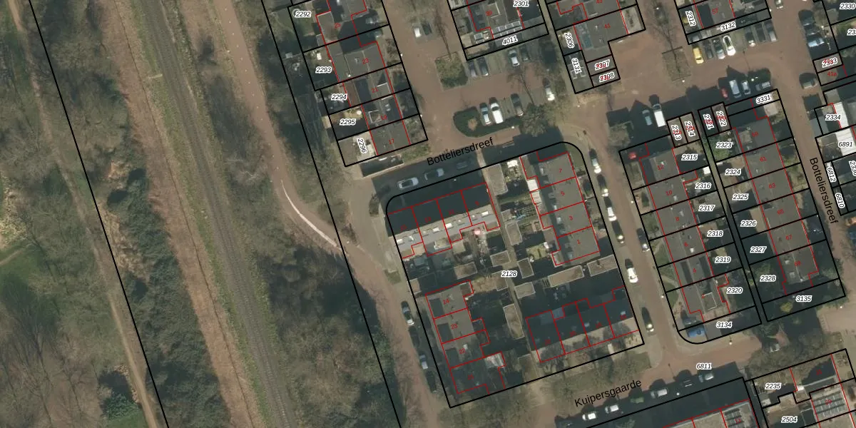 Het perceel waarop Botteliersdreef 13 staat heeft een oppervlakte van 2418 m². Dit is een zeer groot perceel. De perceeloppervlakte wordt geregistreerd door het Kadaster. Gedetailleerde informatie over de maten van dit perceel kunt u vinden in het rapport Kadastrale kaart met maatvoering van Botteliersdreef 13.