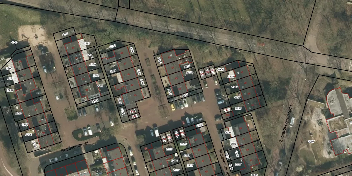 Botteliersdreef 57 is gelegen op kadastraal perceel CUI00A2312. Deze kadastrale aanduiding is uniek en wordt gebruikt door het Kadaster om eigendomsrechten en andere zakelijke rechten vast te leggen. Het perceel maakt onderdeel uit van de kadastrale gemeente Cuijk.