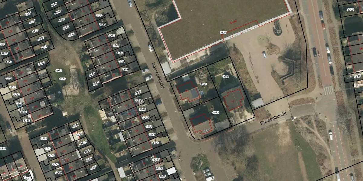 Dassenburcht 40 is gelegen op kadastraal perceel CUI00C4069. Deze kadastrale aanduiding is uniek en wordt gebruikt door het Kadaster om eigendomsrechten en andere zakelijke rechten vast te leggen. Het perceel maakt onderdeel uit van de kadastrale gemeente Cuijk.