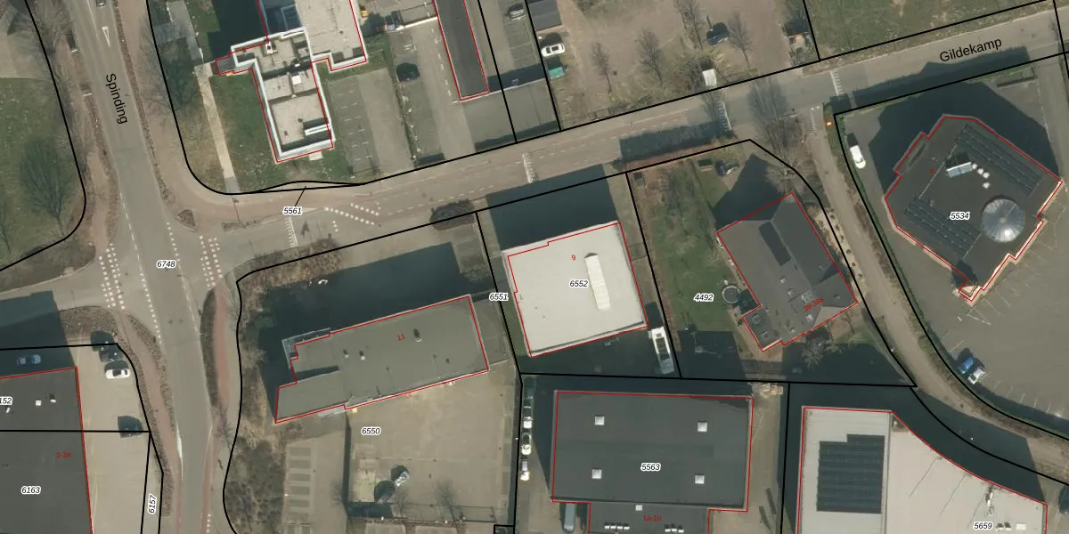 Gildekamp 9 is gelegen op kadastraal perceel CUI00A6552. Deze kadastrale aanduiding is uniek en wordt gebruikt door het Kadaster om eigendomsrechten en andere zakelijke rechten vast te leggen. Het perceel maakt onderdeel uit van de kadastrale gemeente Cuijk.