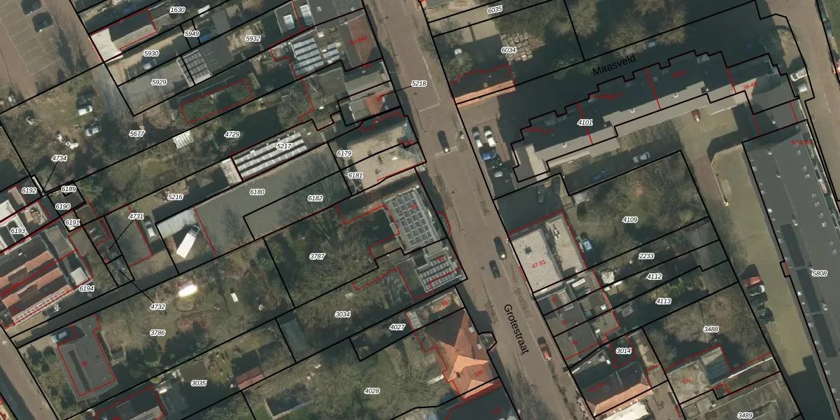 Het perceel waarop Grotestraat 94 staat heeft een oppervlakte van 735 m². Dit is een groot perceel. De perceeloppervlakte wordt geregistreerd door het Kadaster. Gedetailleerde informatie over de maten van dit perceel kunt u vinden in het rapport Kadastrale kaart met maatvoering van Grotestraat 94.