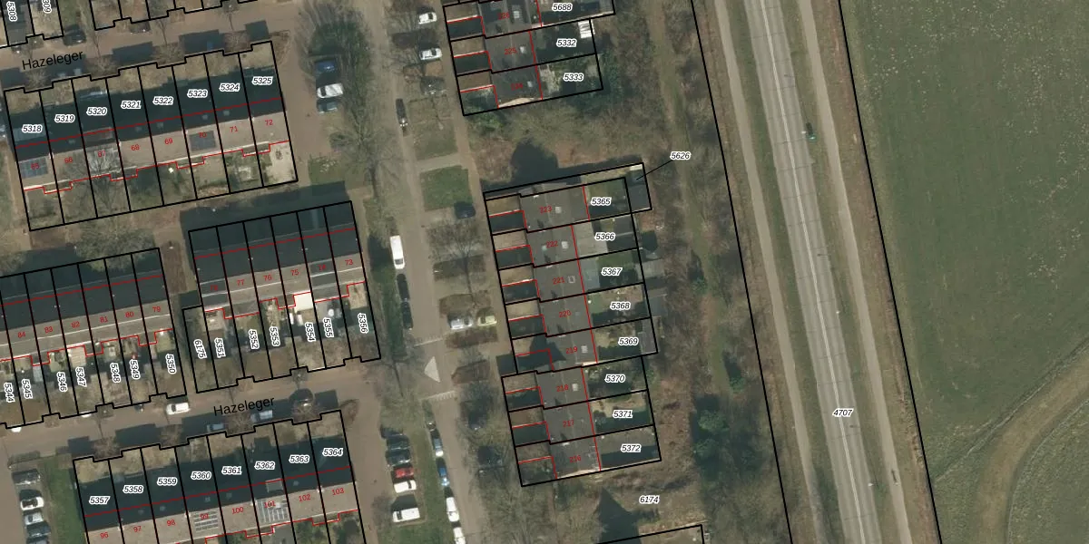 Hazeleger 221 is gelegen op kadastraal perceel CUI00C5367. Deze kadastrale aanduiding is uniek en wordt gebruikt door het Kadaster om eigendomsrechten en andere zakelijke rechten vast te leggen. Het perceel maakt onderdeel uit van de kadastrale gemeente Cuijk.