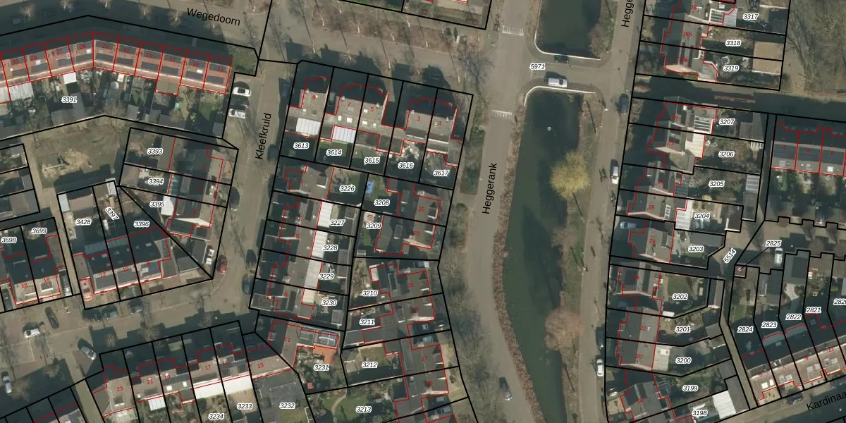 Het perceel waarop Heggerank 25 staat heeft een oppervlakte van 182 m². Dit is een middelgroot perceel. De perceeloppervlakte wordt geregistreerd door het Kadaster. Gedetailleerde informatie over de maten van dit perceel kunt u vinden in het rapport Kadastrale kaart met maatvoering van Heggerank 25.