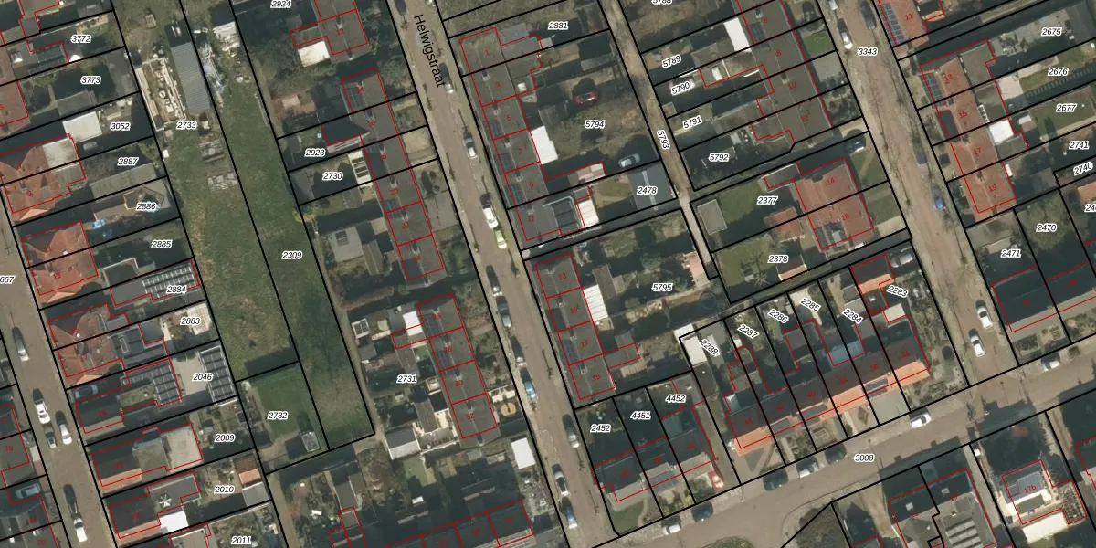 Het perceel waarop Helwigstraat 13 staat heeft een oppervlakte van 930 m². Dit is een groot perceel. De perceeloppervlakte wordt geregistreerd door het Kadaster. Gedetailleerde informatie over de maten van dit perceel kunt u vinden in het rapport Kadastrale kaart met maatvoering van Helwigstraat 13.