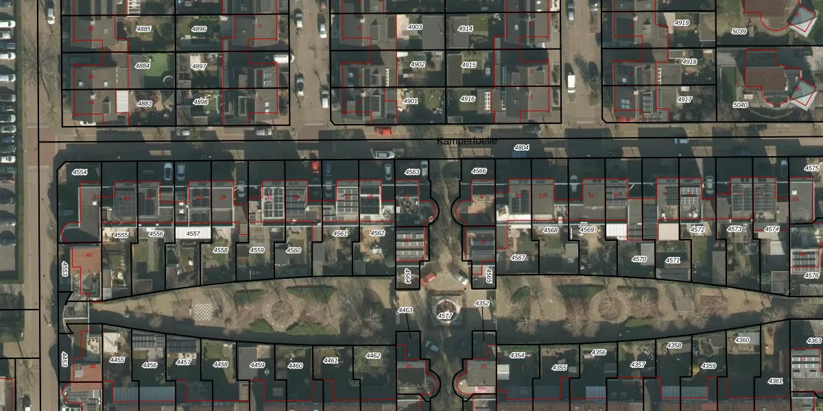 Kamperfoelie 23 is gelegen op kadastraal perceel CUI00A4563. Deze kadastrale aanduiding is uniek en wordt gebruikt door het Kadaster om eigendomsrechten en andere zakelijke rechten vast te leggen. Het perceel maakt onderdeel uit van de kadastrale gemeente Cuijk.