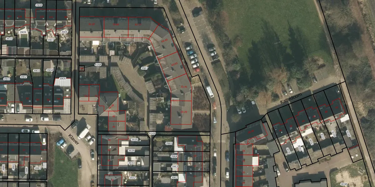Het perceel waarop Kattedoorn 31 staat heeft een oppervlakte van 3855 m². Dit is een zeer groot perceel. De perceeloppervlakte wordt geregistreerd door het Kadaster. Gedetailleerde informatie over de maten van dit perceel kunt u vinden in het rapport Kadastrale kaart met maatvoering van Kattedoorn 31.