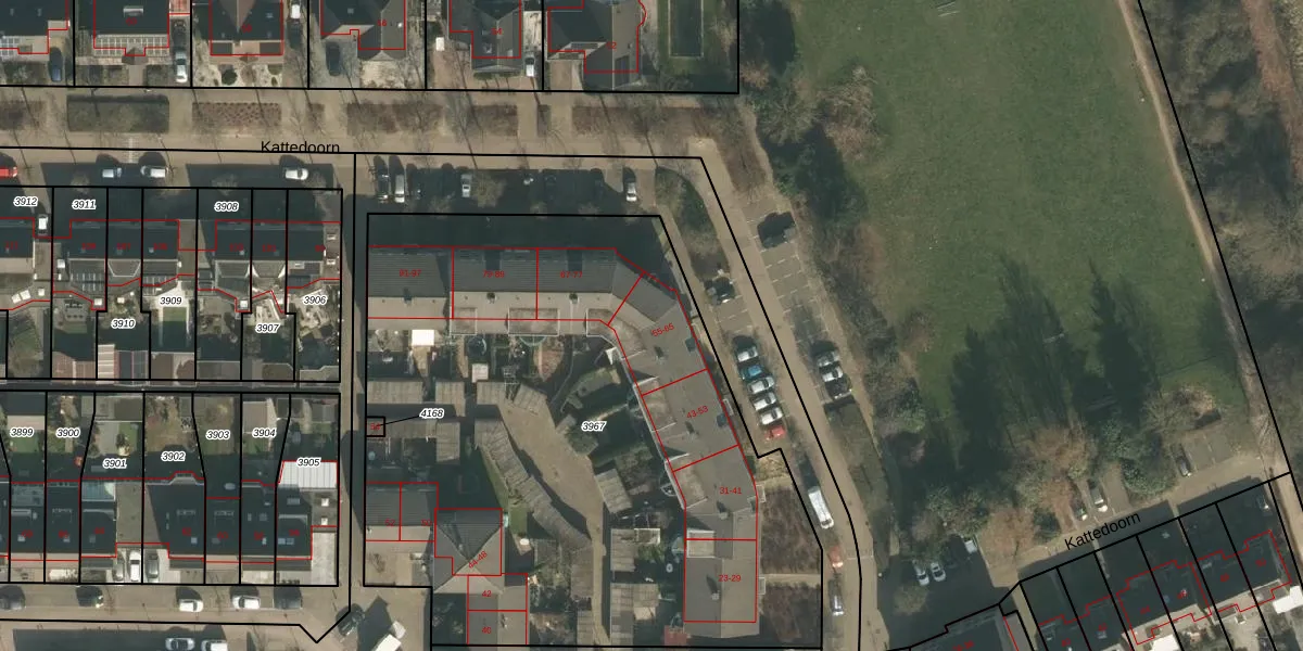 Kattedoorn 61 is gelegen op kadastraal perceel CUI00A3967. Deze kadastrale aanduiding is uniek en wordt gebruikt door het Kadaster om eigendomsrechten en andere zakelijke rechten vast te leggen. Het perceel maakt onderdeel uit van de kadastrale gemeente Cuijk.
