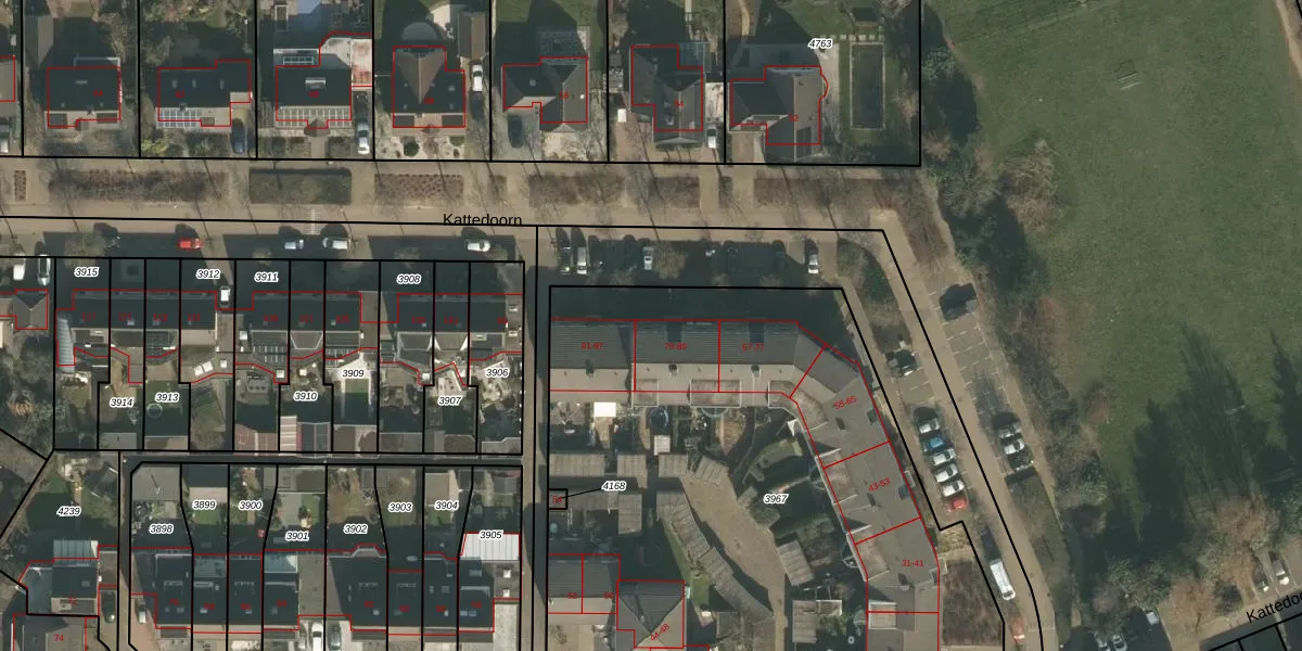 Het perceel waarop Kattedoorn 81 staat heeft een oppervlakte van 3855 m². Dit is een zeer groot perceel. De perceeloppervlakte wordt geregistreerd door het Kadaster. Gedetailleerde informatie over de maten van dit perceel kunt u vinden in het rapport Kadastrale kaart met maatvoering van Kattedoorn 81.