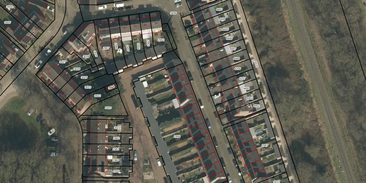 Het perceel waarop Kruisdistel 51 staat heeft een oppervlakte van 2041 m². Dit is een zeer groot perceel. De perceeloppervlakte wordt geregistreerd door het Kadaster. Gedetailleerde informatie over de maten van dit perceel kunt u vinden in het rapport Kadastrale kaart met maatvoering van Kruisdistel 51.