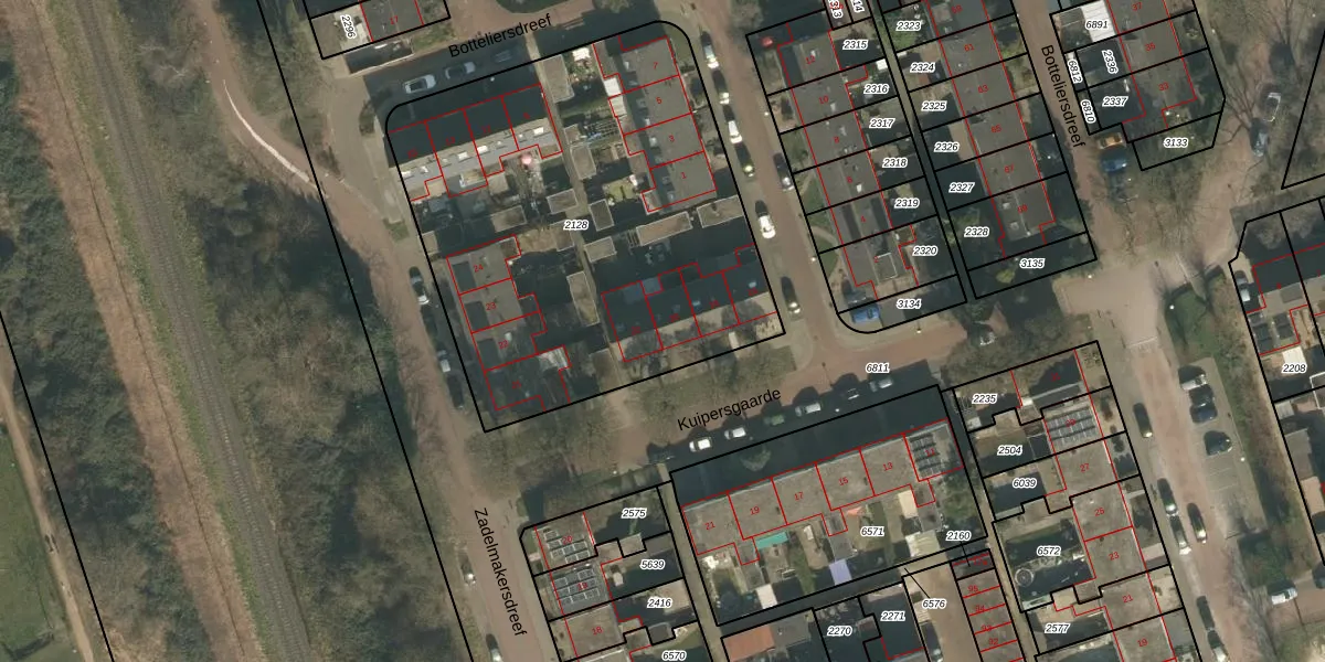 Het perceel waarop Kuipersgaarde 20 staat heeft een oppervlakte van 2418 m². Dit is een zeer groot perceel. De perceeloppervlakte wordt geregistreerd door het Kadaster. Gedetailleerde informatie over de maten van dit perceel kunt u vinden in het rapport Kadastrale kaart met maatvoering van Kuipersgaarde 20.
